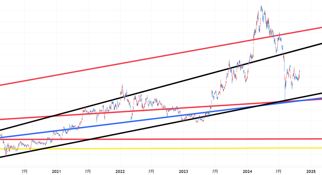 株価が上昇する場合は「上から見て1番目の赤いライン。」上から見て1番目の黒いライン。」が抵抗線(レジスタンスライン)になると思われます。